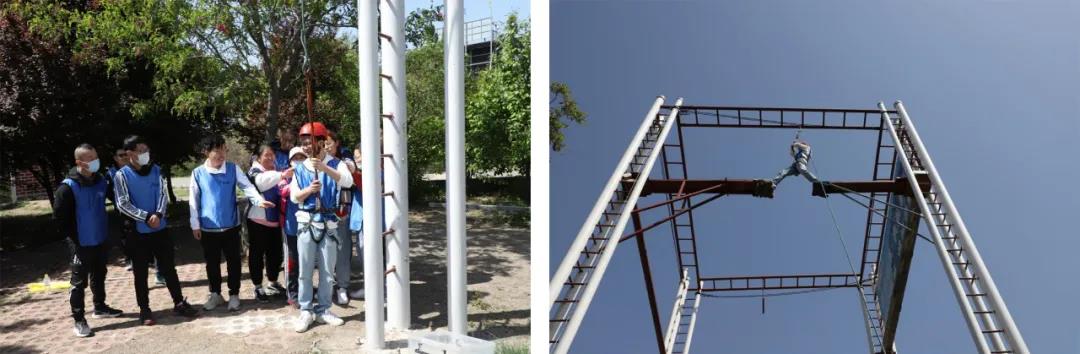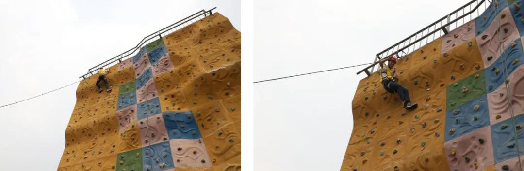 “勇攀高峰”,隊(duì)員在穿戴好裝備的前提下,按照教練的指導(dǎo),進(jìn)行攀登。