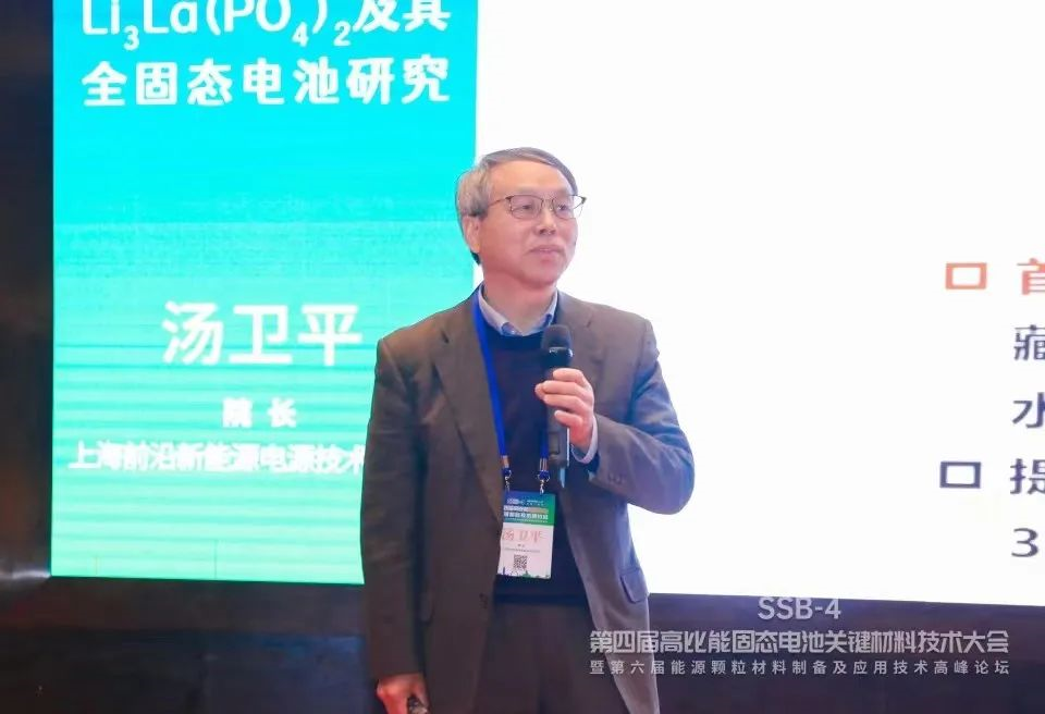 2023年2月21日至22日,第四屆高比能固態(tài)電池關(guān)鍵材料技術(shù)研討會(huì)暨關(guān)鍵材料技術(shù)研討會(huì)在江蘇常州開(kāi)幕,湯衛(wèi)平院長(zhǎng)做了“新型固態(tài)電解質(zhì)Li3La(PO4)2及全固態(tài)電池研究”主題報(bào)告。報(bào)告介紹了使用離子交換法,以Na3La(PO4)2(NLP)為前驅(qū)體,成功合成新型固態(tài)電解質(zhì)材料Li3La(PO4)2(LLP)的研究成果。LLP基本保持了NLP的結(jié)晶結(jié)構(gòu),是第一次報(bào)道的化合物。更為有趣的是LLP的楊氏模量?jī)H為19MPa,與硫系固態(tài)電解質(zhì)相當(dāng),意味著LLP是第一個(gè)被發(fā)現(xiàn)的除了硫化物以外的低楊氏模量的氧化物固態(tài)電解質(zhì)材料。LLP可在室溫加壓下形成致密固態(tài)電解質(zhì)薄片,總離子電導(dǎo)率達(dá)到10-4S/cm,對(duì)鋰穩(wěn)定性優(yōu)異;基于該材料的低楊氏模量特點(diǎn),報(bào)告第一次用冷壓方法制備了氧化物全固態(tài)電池,并獲得了良好的充放電性能。